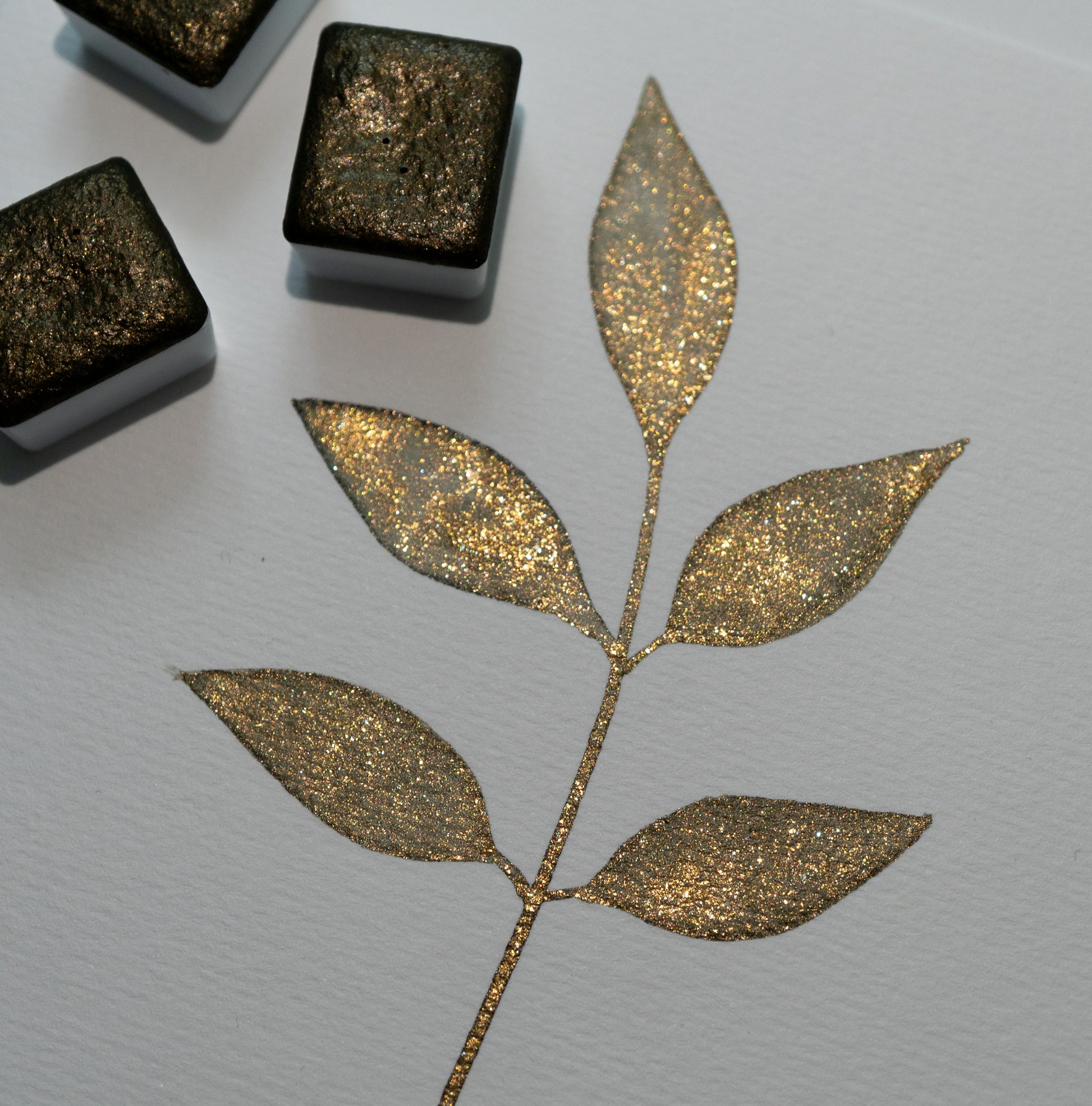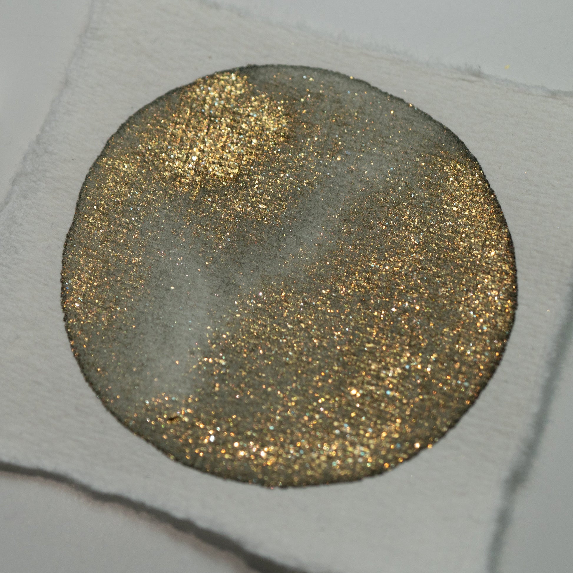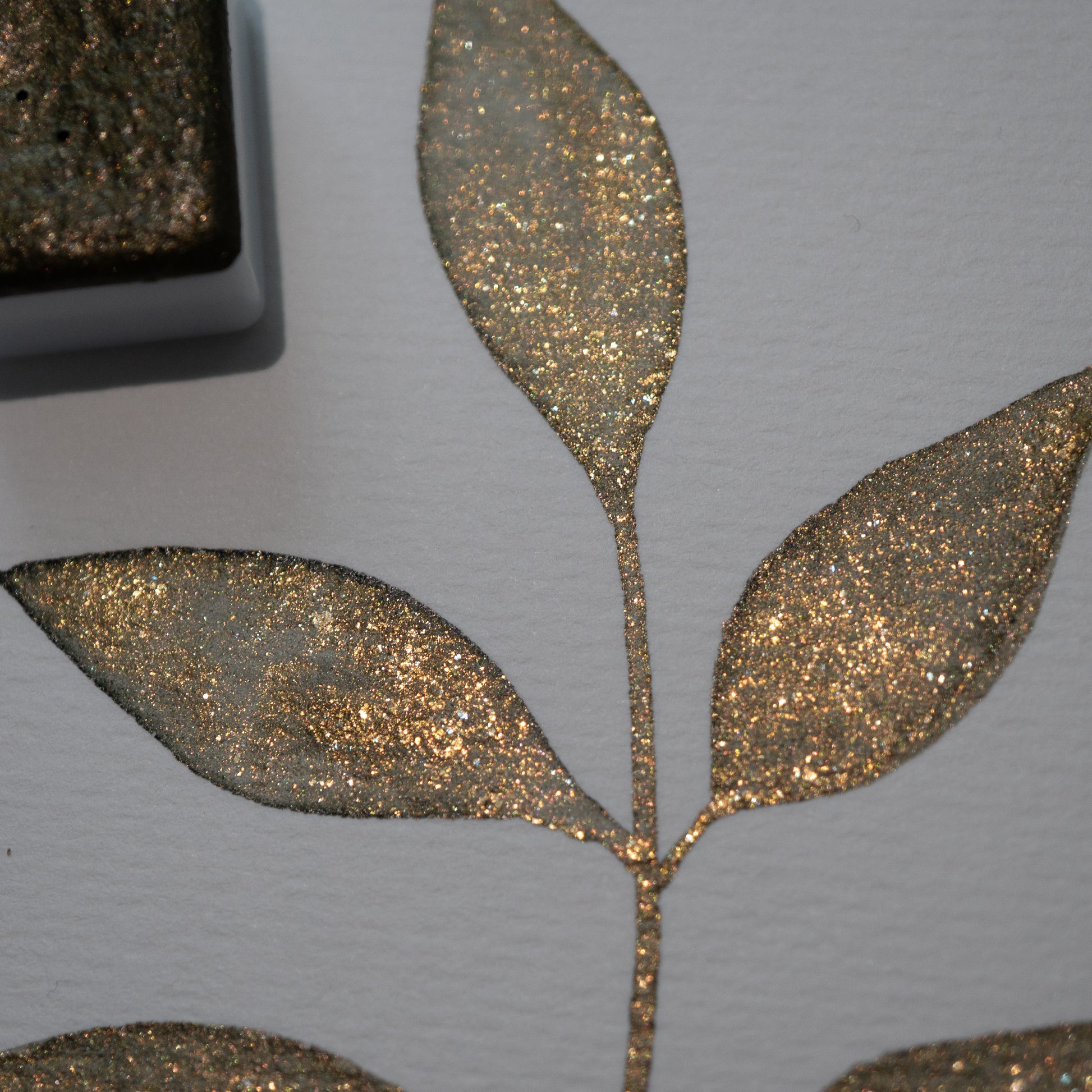 Leafy Glow is an earthy brown-green watercolor infused with soft golden shimmer that radiates under the light. When dry, the base reveals muted tones of mossy green and warm brown, while the golden shimmer brings a gentle sunlit glow, reminiscent of leaves touched by light.