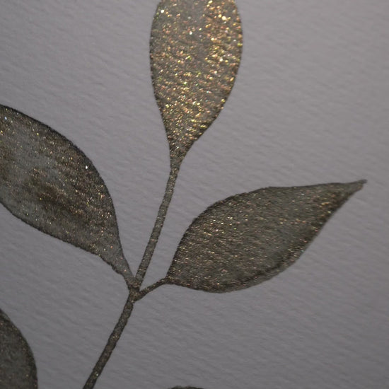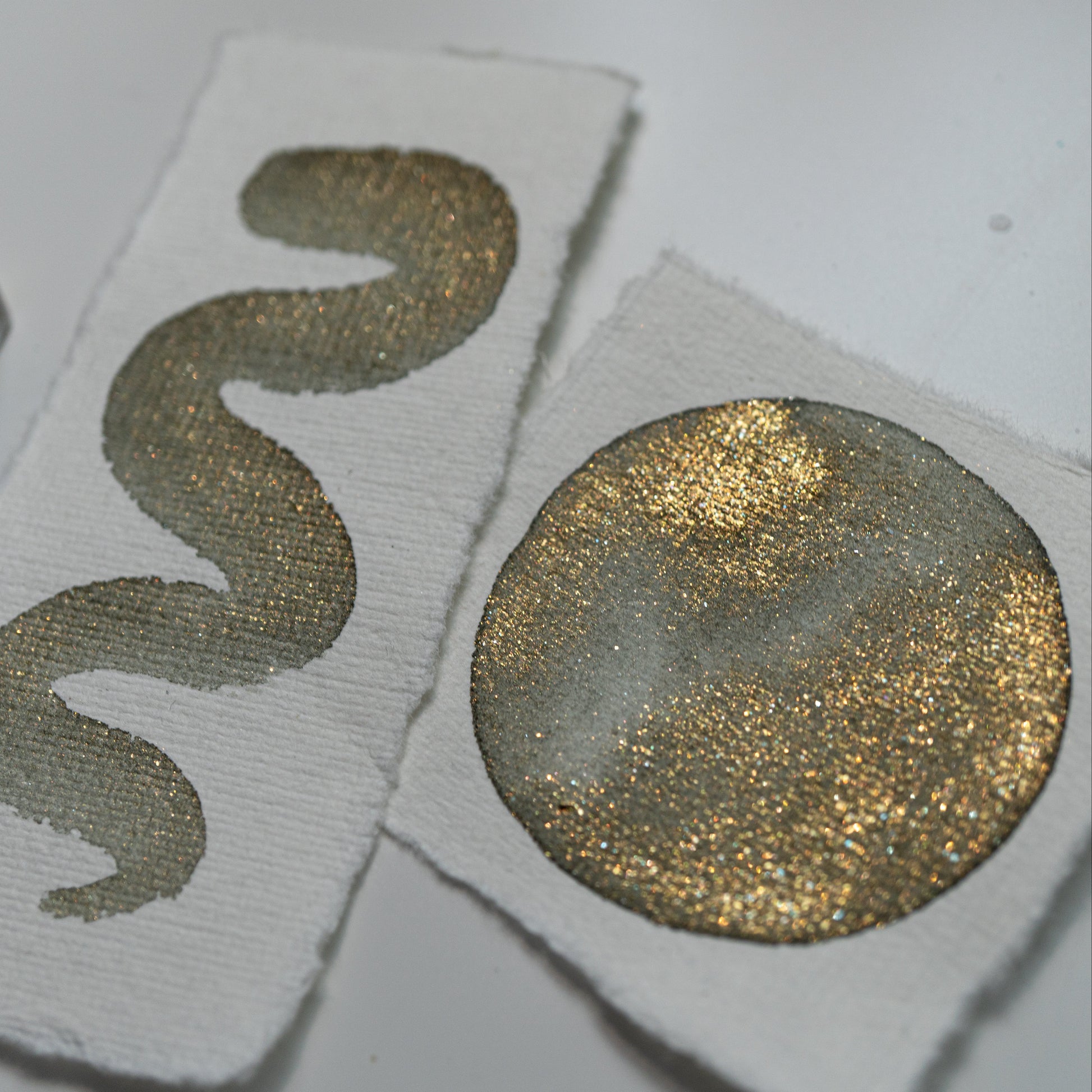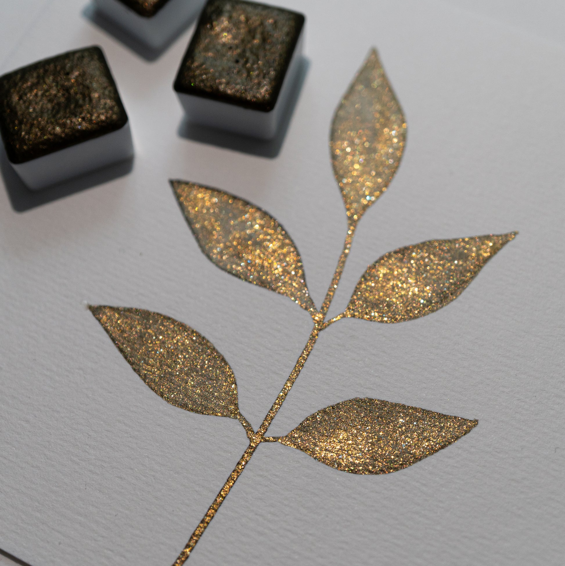 Leafy Glow is an earthy brown-green watercolor infused with soft golden shimmer that radiates under the light. When dry, the base reveals muted tones of mossy green and warm brown, while the golden shimmer brings a gentle sunlit glow, reminiscent of leaves touched by light.