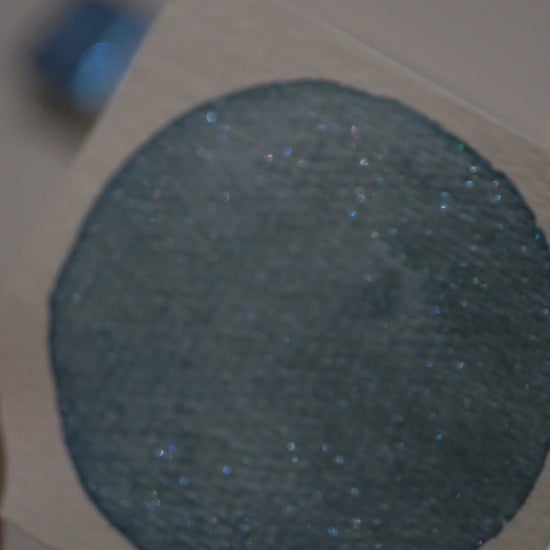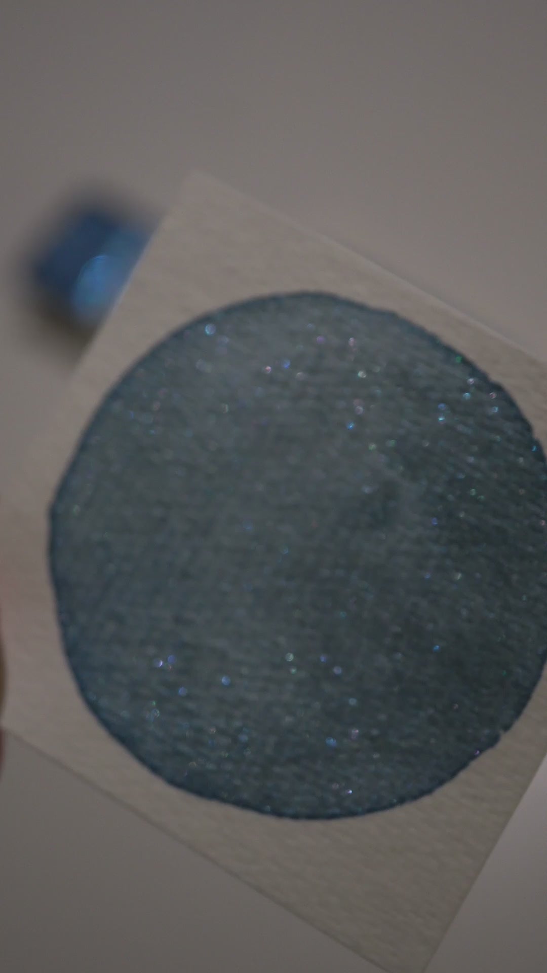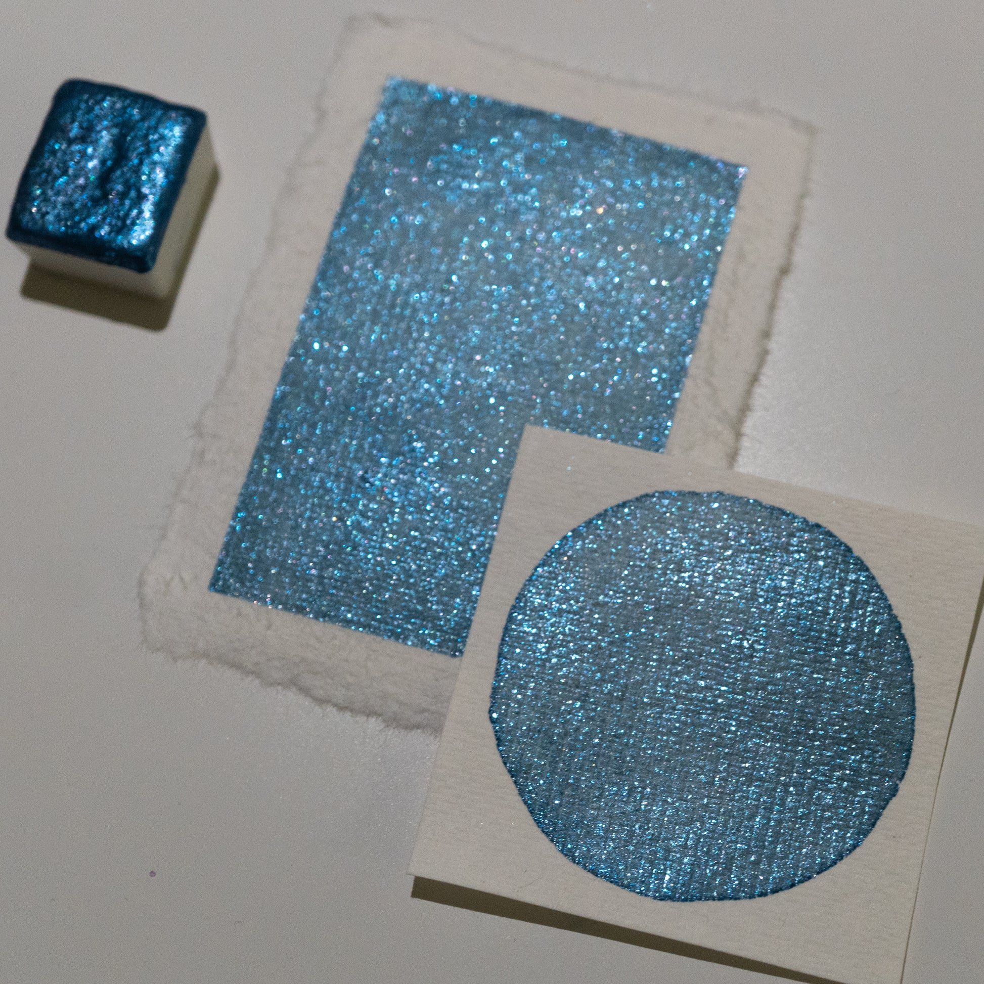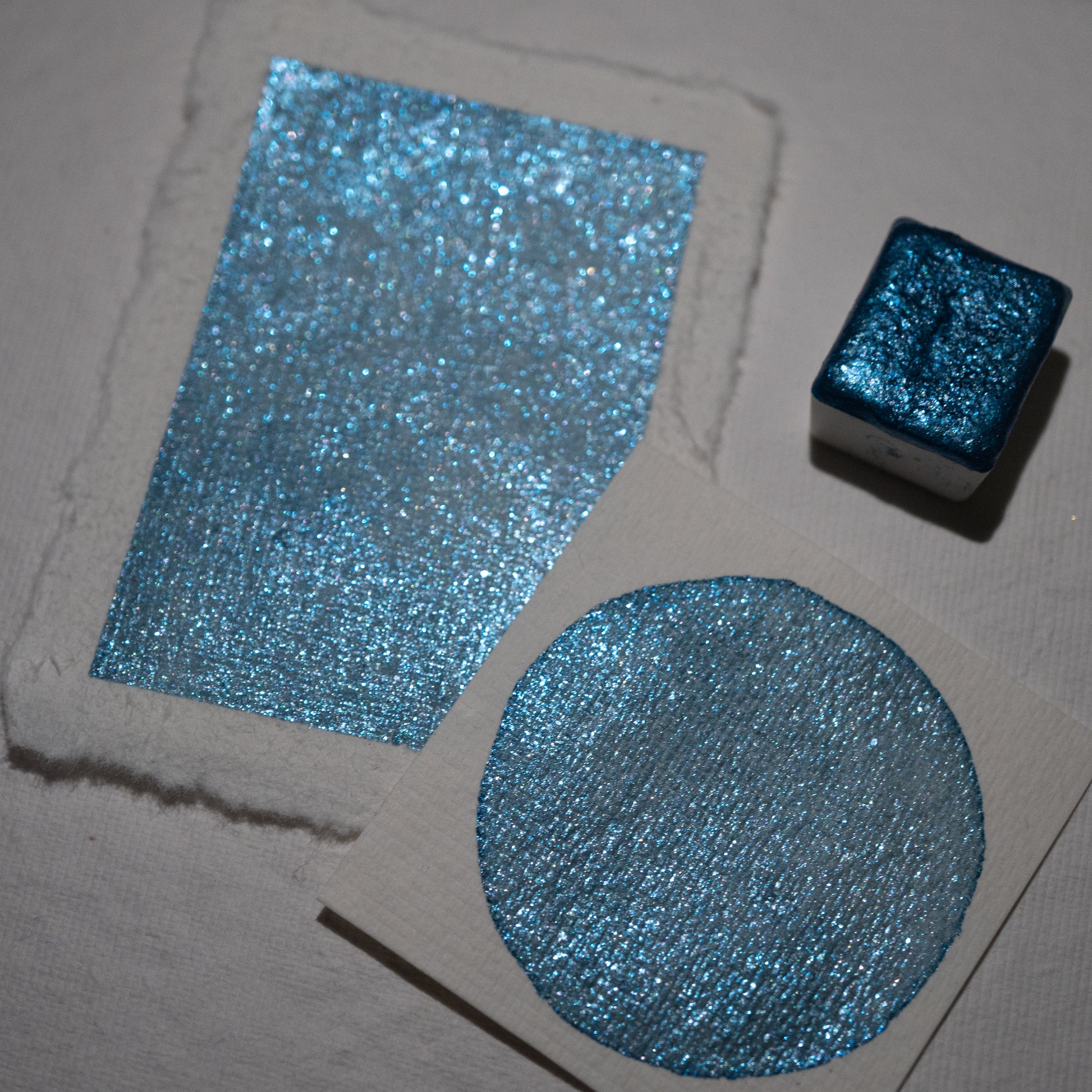 Blue sparkles infused with indigo pigment which gives a bright shimmer blue subtle shades of midnight indigo. This color takes longer to activate, therefore allow drops of water to rest on the watercolor for 3-4 minutes. Please note this is not an extremely opaque watercolor.